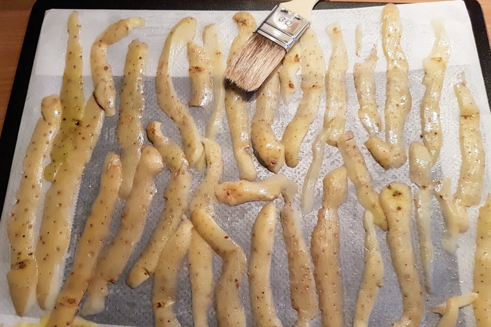Étalez les épluchures sur une plaque de four recouverte de papier cuisson.
