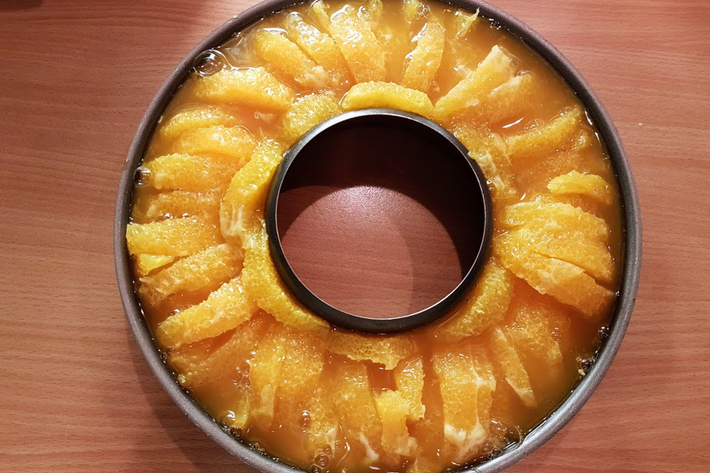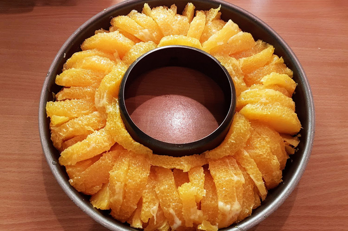 Disposez les quartiers d’orange bien serrés dans le moule.