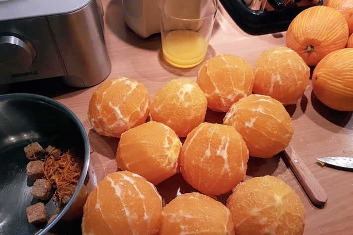Pressez avec une main les membranes des oranges au-dessus de la casserole avec le zeste.