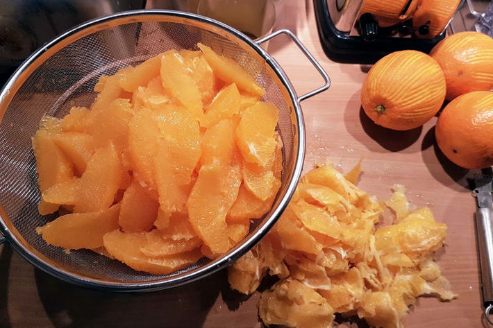 Pelez les 9 autres oranges à vif (explications dans cette recette > clic) au-dessus d’un saladier sur lequel vous posez une passoire de façon à égoutter les quartiers d’orange dedans et à en recueillir le jus.