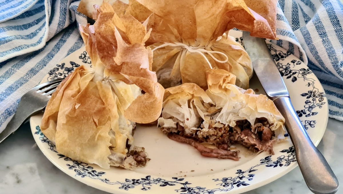 Je vous suggère une façon surprenante et ultra-facile de servir des andouillettes. L’intérieur de l’andouillette est enfermé dans des feuilles de filo, liées en aumônière. Mais vous pouvez aussi les emballer plus classiquement, à la manière d’un chausson.