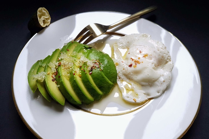 Coupez les avocats en deux, retirez le noyau (sans vous blesser !), épluchez les et émincez chaque moitié sur chacune des assiettes.