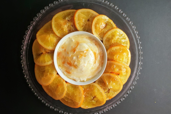 Coupez 2 oranges en tranches fines et mettez-les dans le sirop.