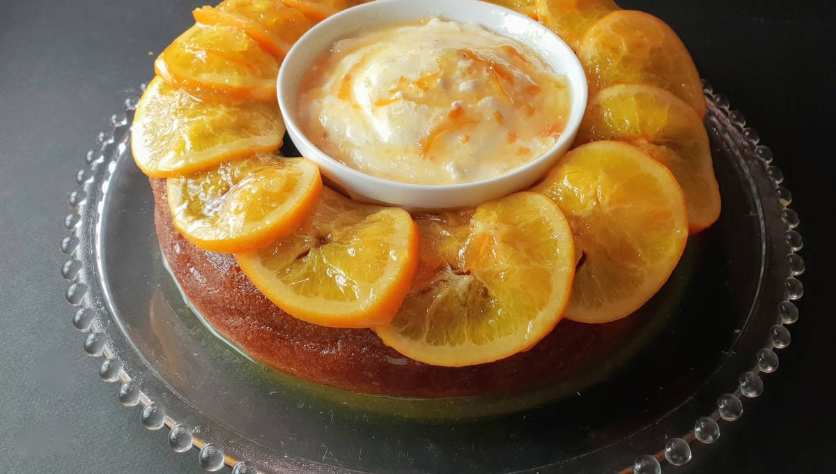 Vous pouvez laisser la mousse à l’orange dans le bol au centre du baba ou bien la démouler au centre du baba, mais c’est plus risqué parce que le fond du plat à tarte est humidifié par le sirop du baba.