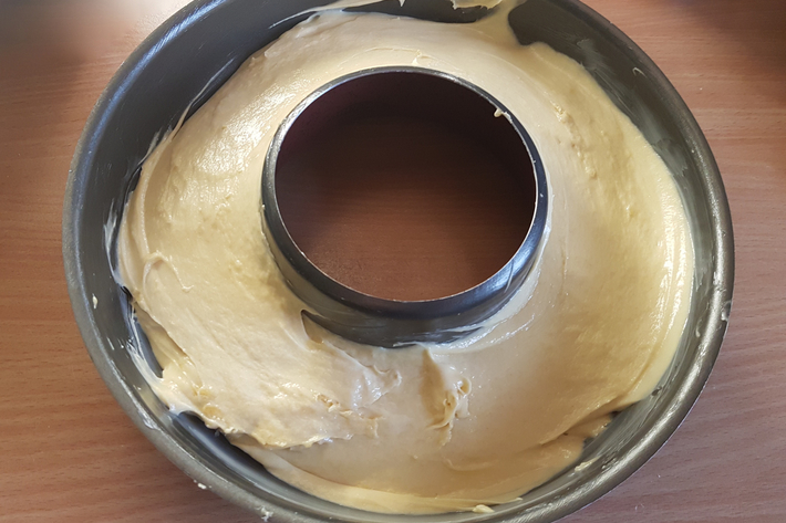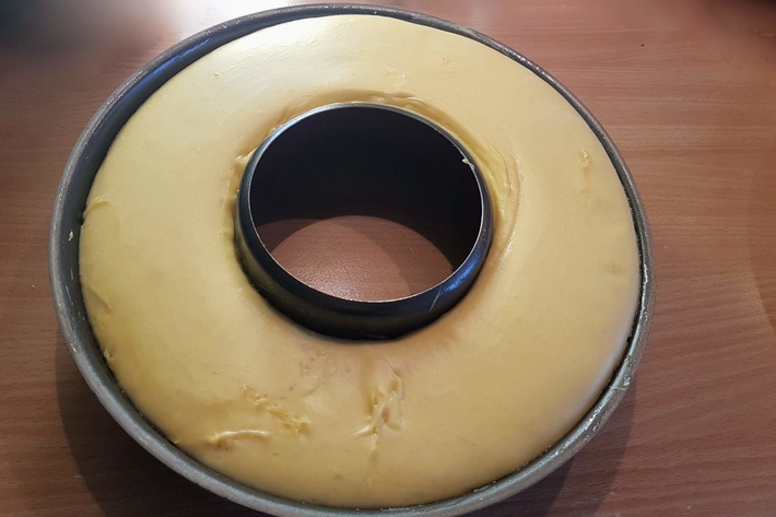 Beurrez le moule à savarin et versez-y la pâte (elle semble absolument ne pas remplir le moule) et laissez lever encore 1 heure jusqu’à ce que la pâte arrive presqu’au bord du moule.