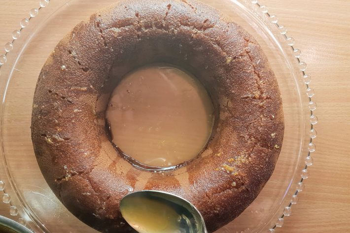 Piquez le baba en plusieurs points avec les dents d’une fourchette et imbibez-le encore tiède avec un tiers du sirop. Procédez doucement, arrosez en vous aidant d’une cuiller.
