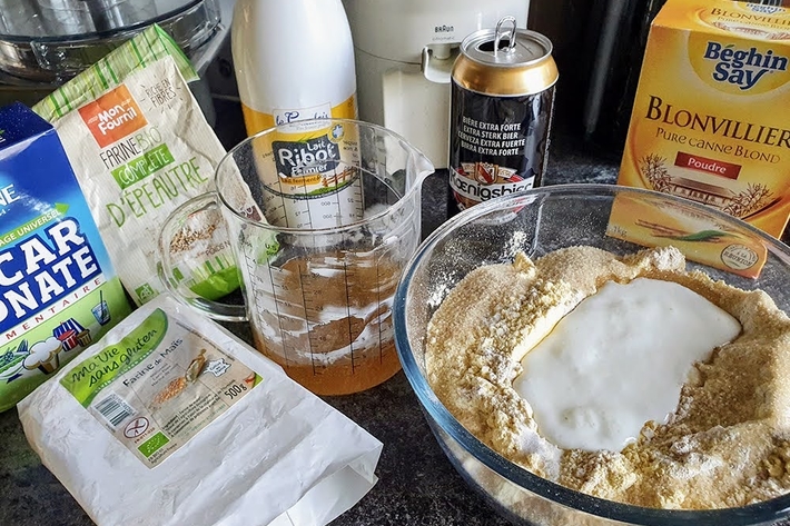 Mélangez les farines dans un grand saladier (j’ai utilisé de la farine ordinaire et de la farine de maïs, ce qui me restait) avec la cassonade, le bicarbonate de soude et le sel.