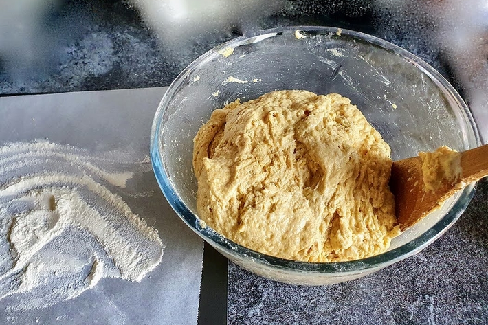Mélangez avec une spatule jusqu’à ce que la pâte se rassemble en boule.