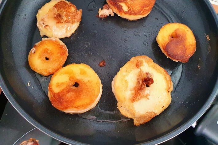 Attrapez les tranches de pomme enrobées de pâte avec les dents d’une fourchette en les égouttant avant de les déposer dans la poêle avec l’huile chaude.