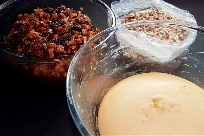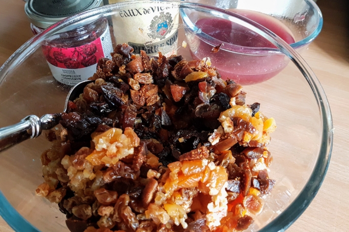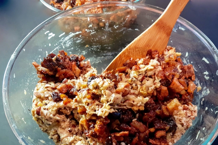 Incorporez alors les noix et noisettes hachées, les fruits macérés et les épices.