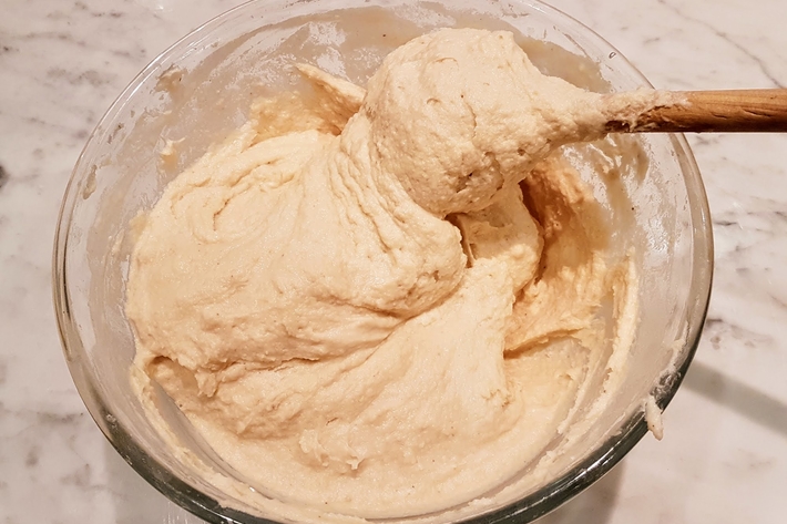 Amalgamez avec une cuiller en bois, sans laisser refroidir, jusqu’à ce que la consistance devienne lisse.