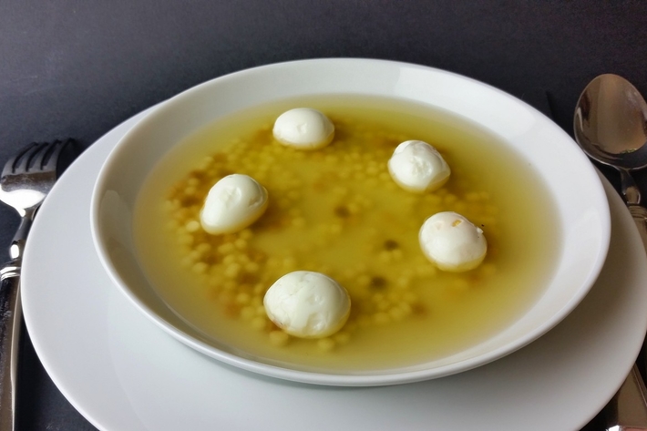 Mettez au frais suffisamment de bouillon pour le nombre d’assiettes ou bols nécessaires après l’avoir filtré à travers un papier absorbant dans une passoire.