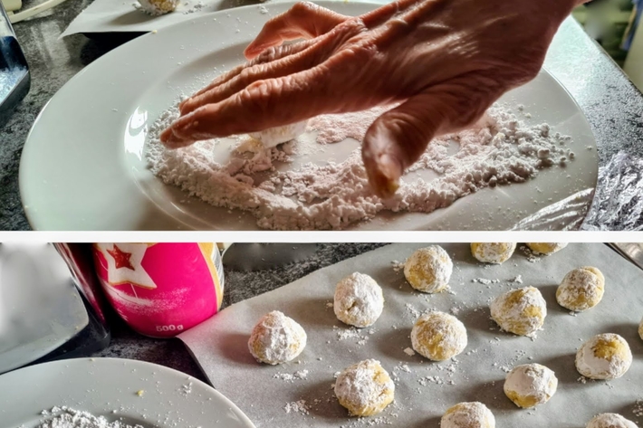 Prenez un peu de pâte entre deux cuillers et roulez en boule entre les paumes de vos mains. Roulez les boules dans le sucre glace.