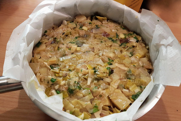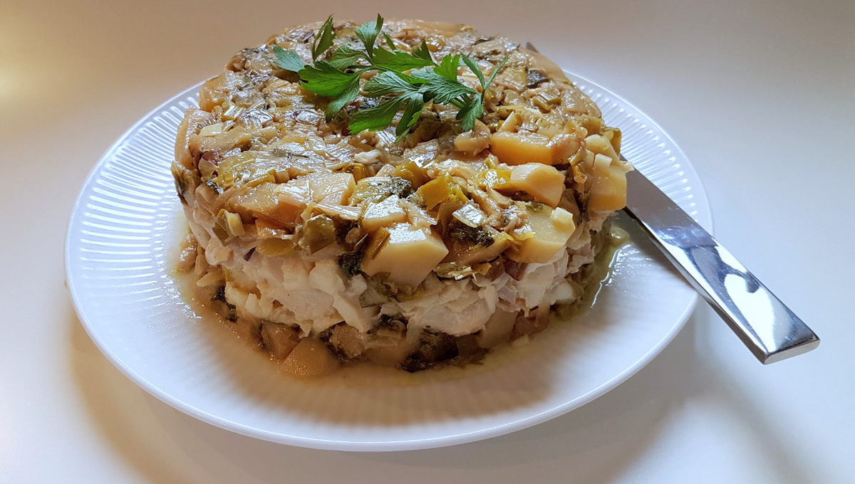 Déposez la moitié du mélange poireaux-pommes de terre dans le fond du moule, puis le cabillaud et terminez avec la fin des légumes.