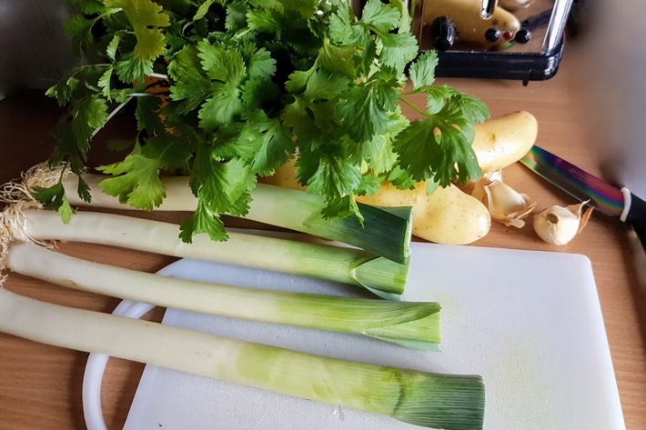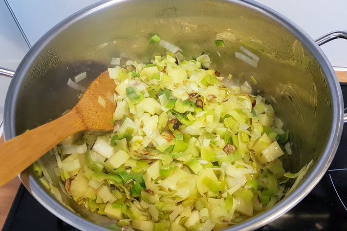 Ajoutez les poireaux, les pommes de terre et l’ail.