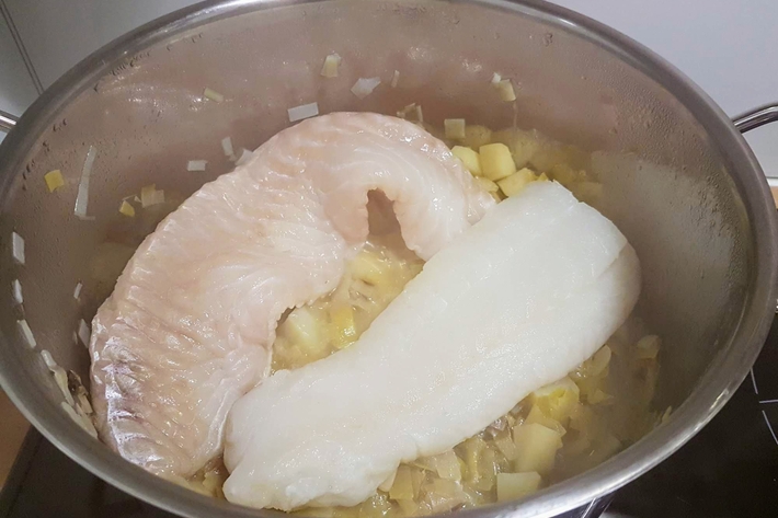 Posez le cabillaud sur les légumes et faites-le cuire ainsi 5 minutes à la vapeur des légumes. Préchauffez le four à 180° (thermostat 6).