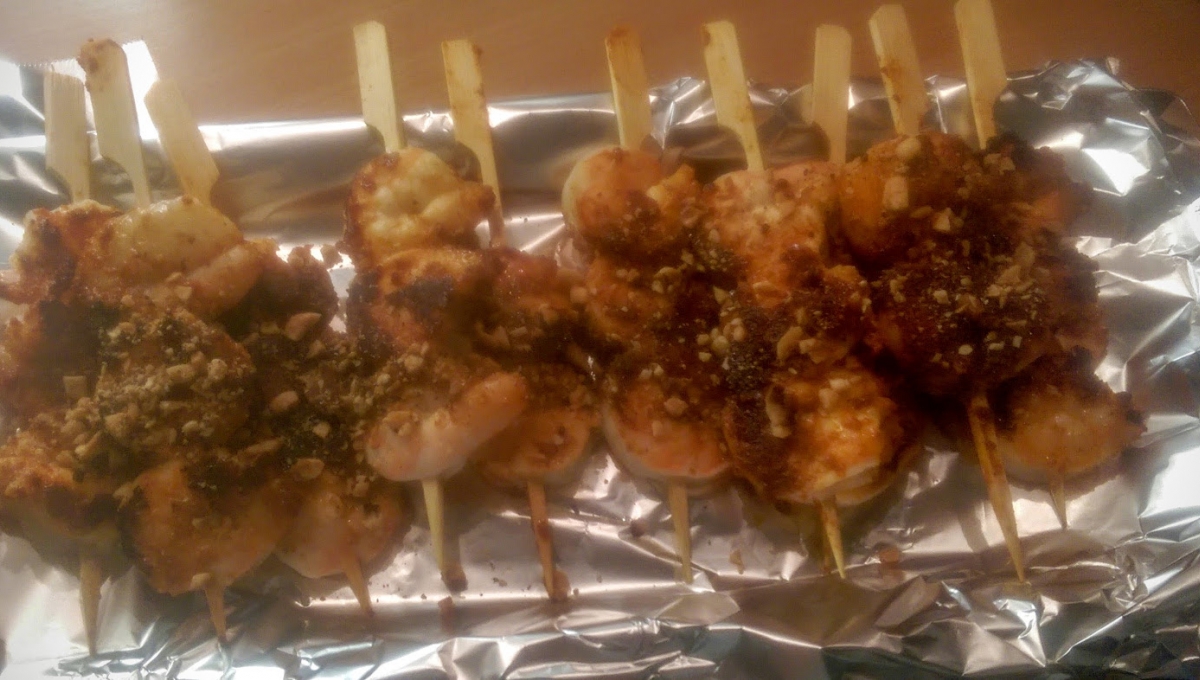 Des petits amuse-gueule pour réception debout. Les crevettes sont épluchées, bien sûr, et grâce aux brochettes, on mange proprement avec ses doigts, sans batailler avec des couverts. Vous remarquez sans doute que je mets du saté partout… Mais vous y viendrez sûrement.