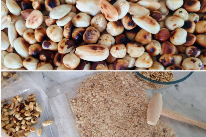Si vous n’avez pas acheté les amandes et les noisettes préalablement émondées, faites-le vous-même (un jour où vous avez assez de temps). C’est plus long, mais meilleur.