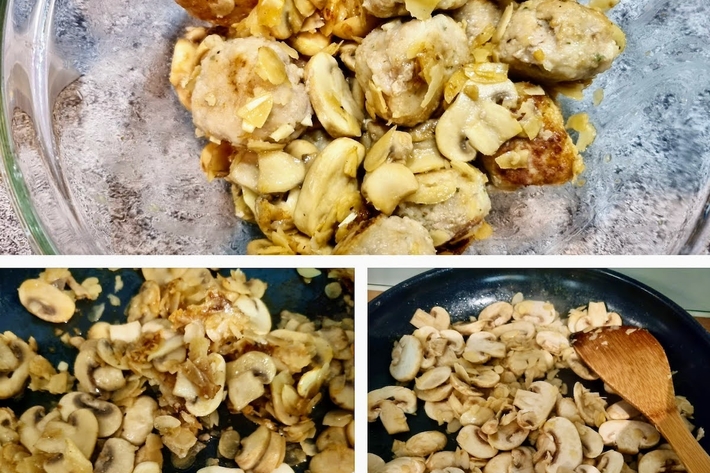 Mettez les champignons et les amandes dans la poêle, faites-les revenir 5 minutes sur feu moyen puis ajoutez la dernière gousse d’ail. Poursuivez la cuisson 1 minute avant de réserver dans une assiette.