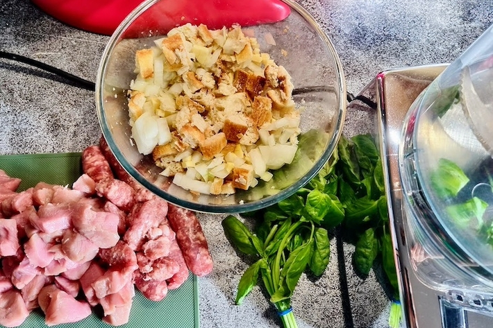 Mixez les viandes (à moins de les avoir achetées déjà hachées), puis ajoutez le pain imbibé de lait, 2 gousses d’ail, les deux tiers des feuilles de basilic ciselées et les oignons. Formez 12 boulettes, roulez-les dans la farine et réservez-les au frais.