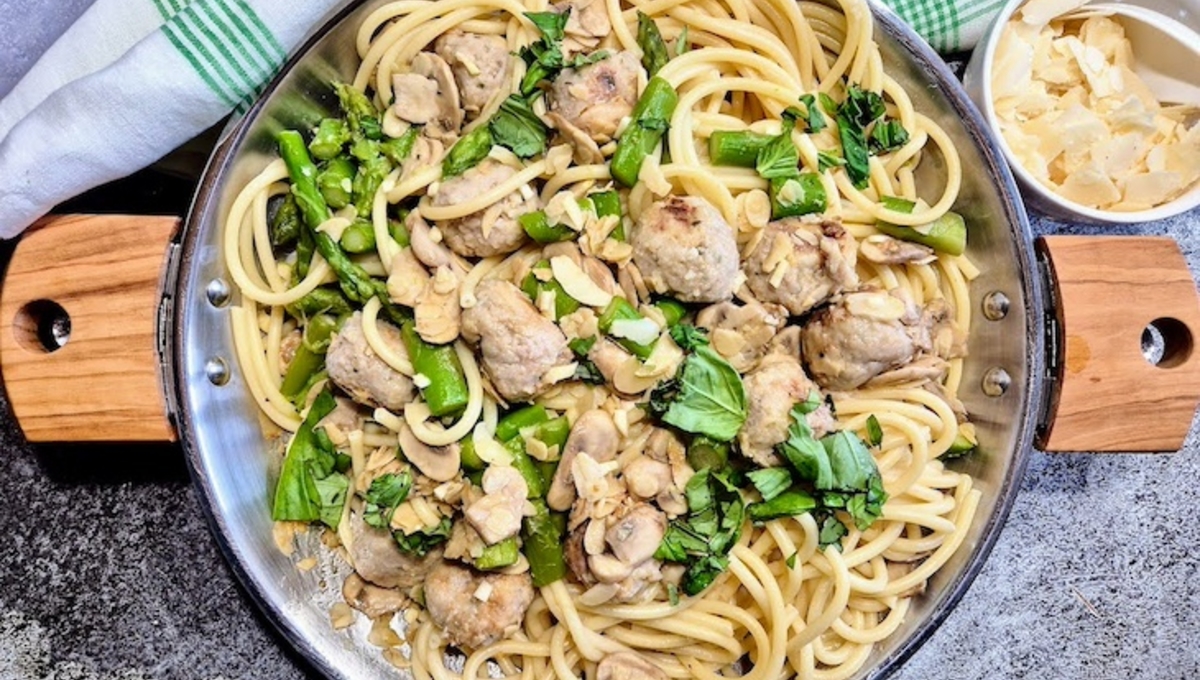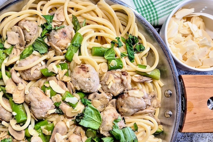 Égouttez les bucatini et les asperges. Transvasez-les dans la poêle avec une louche d’eau de cuisson. Ajoutez les champignons et les amandes, salez, poivrez et mélangez. Ajoutez les boulettes réchauffées et servez aussitôt, avec quelques feuilles de basilic et des lamelles de parmesan.