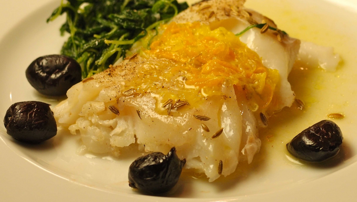 Répartissez les filets de cabillaud et la roquette dans les assiettes, ainsi que les olives noires dénoyautées.