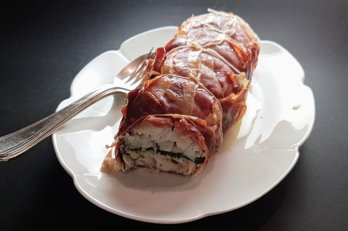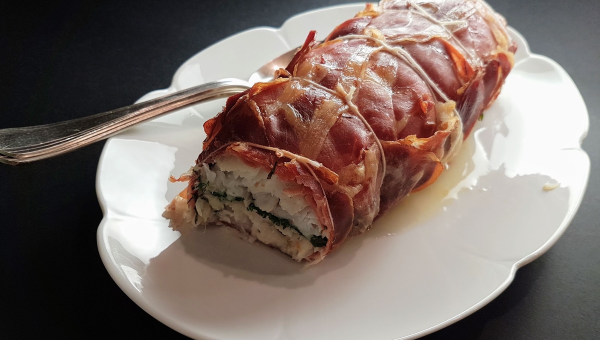 Ça devait être de la lotte. Mais point de lotte chez le poissonnier… Alors ce fut un excellent dos de cabillaud. Vous trouverez de la lotte plus facilement entre mars et mai, mais difficilement entre juin et août. Ces deux poissons s’accommodent très bien d’un peu de viande. Ainsi fourré aux herbes et emballé dans du jambon de Bayonne, directement au four, il n’y a pas plus simple.
