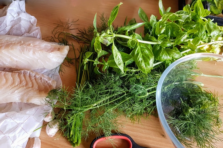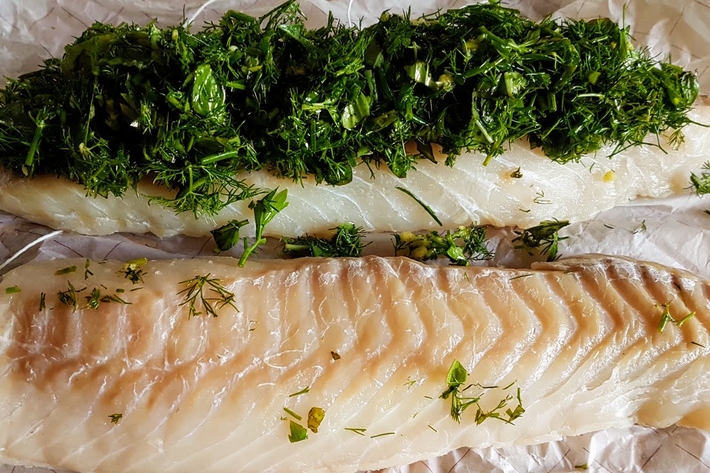 Étalez les herbes sur un des deux pavés de cabillaud poivré et recouvrez-le avec le second. Ficelez-les sans mettre trop de ficelle.
