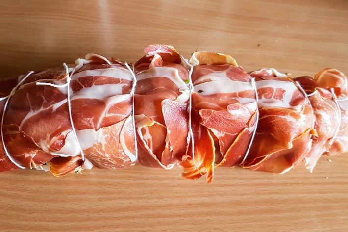Déposez les tranches de jambon de Bayonne sur le plan de travail, en les faisant se chevaucher.
