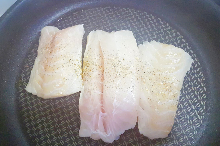 Placez les pavés de cabillaud dans la poêle et laissez cuire d’un seul côté pendant environ 3 minutes, 4 minutes selon l’épaisseur du poisson.
