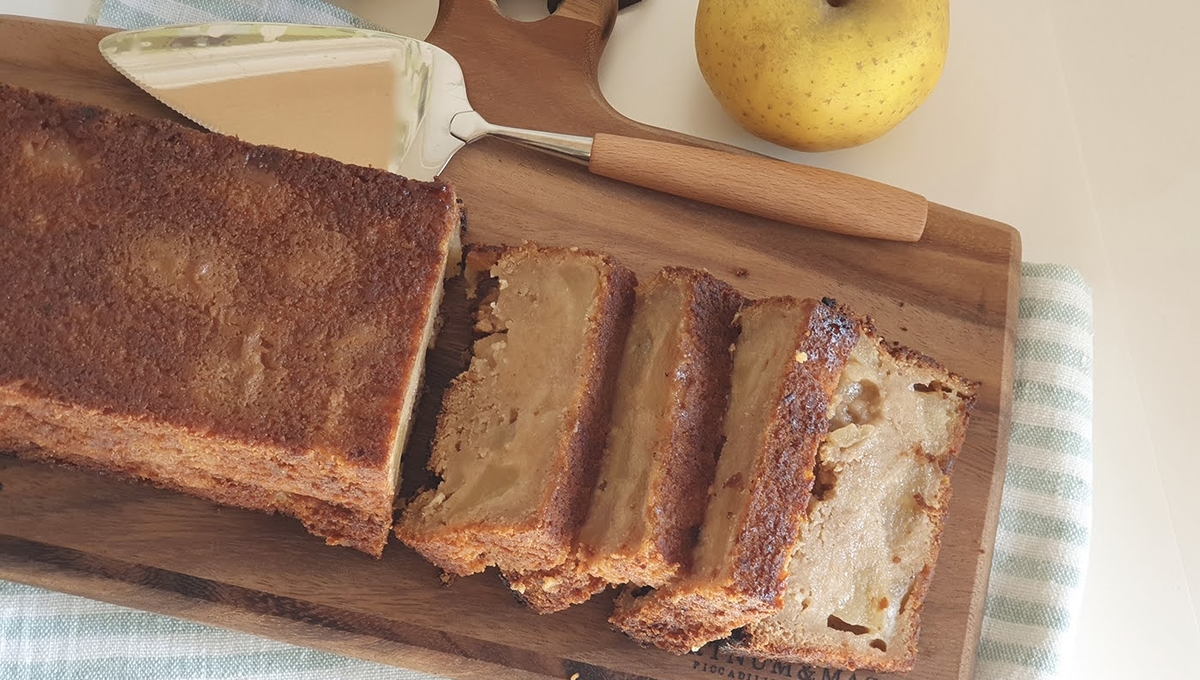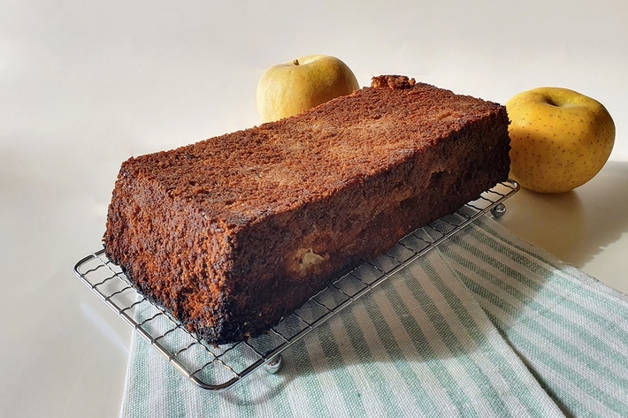 Pomme, pomme, pomme, pomme ! Une recette de pommes de Mamina (je l’en remercie) a encore frappé : un cake tout pomme, pommes râpées, pommes en dés. Et voilà comment, sans œufs, on donne du moelleux et de l’humidité à un gâteau.