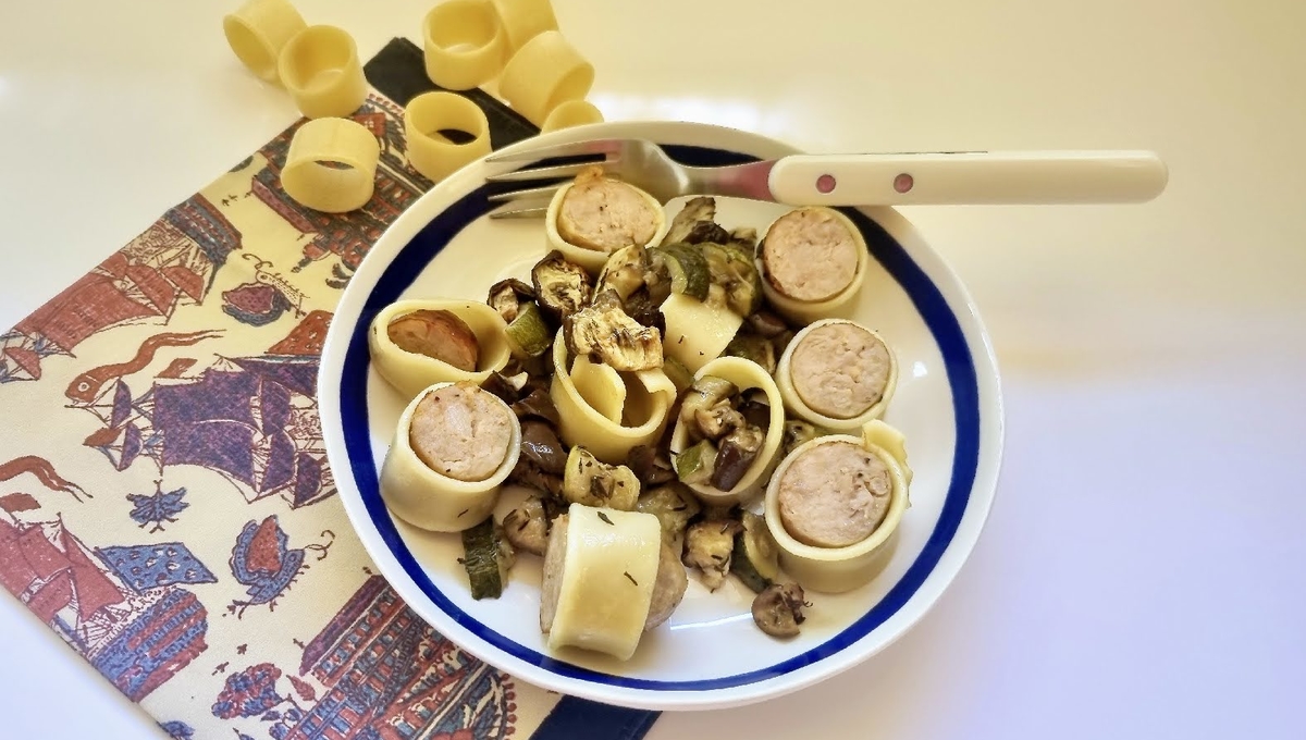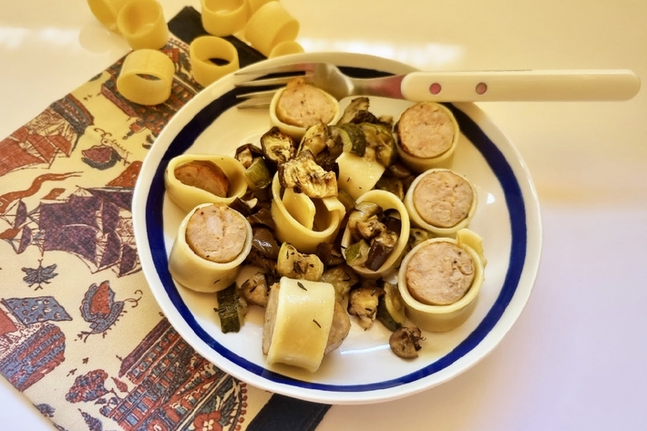 Des calamari ? Oui, ce sont ces pâtes italiennes qui ressemblent à des anneaux de calamar, tout simplement. J’ai eu l’idée et l’envie de les remplir de saucisse de Toulouse, de les entourer d’aubergines et de courgettes rôties, pour un résultat très plaisant.