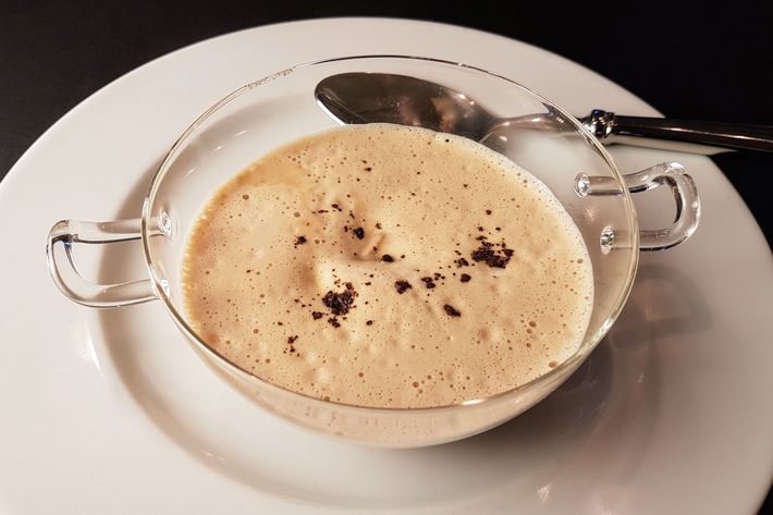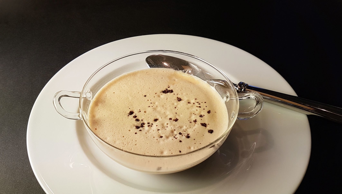 Une nouvelle alliance châtaignes-café assez surprenante, parfumée d’une pointe de cognac, qui se marie si bien avec le café. Le tout surmonté d’une mousse de lait infusé au café.