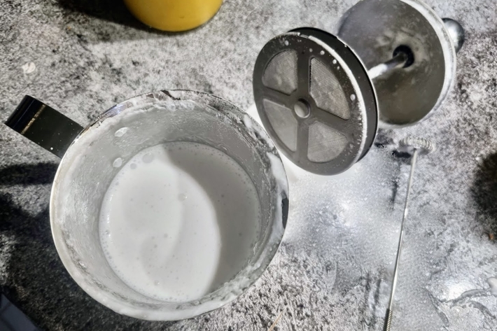 Le lait de coco très frais mousse bien grâce à des petits instruments faciles à trouver, mais le mixer plongeur ou un shaker peut aussi vous dépanner.