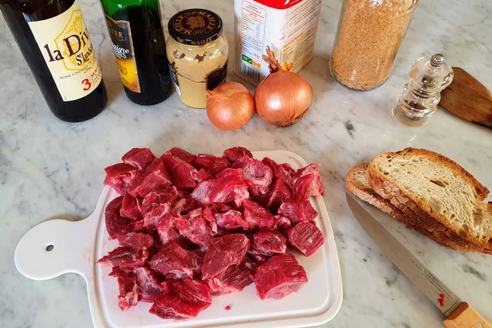 “À défaut de four, vous pouvez cuire la carbonade sur une plaque de cuisson, tout doucement, en remuant régulièrement : 2h30 la veille et une demi-heure avant de servir ou 3 à 4 heures si vous servez la carbonade le jour-même.”