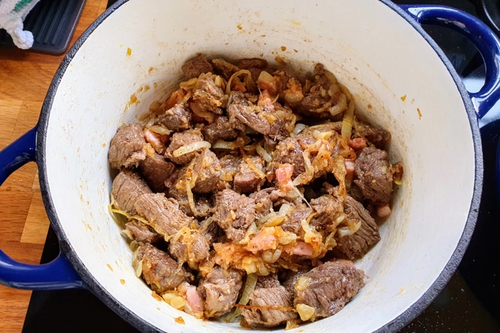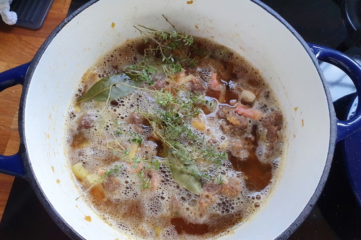 Versez la bière de manière à recouvrir la viande. Complétez, au besoin, avec de l’eau ou un peu plus de bière.