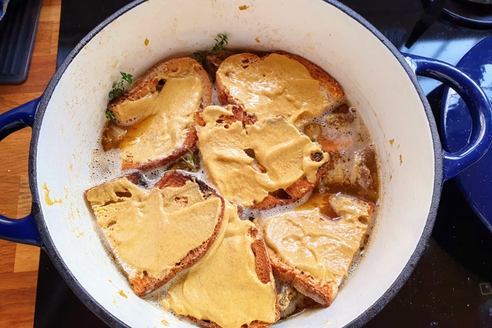 “Le goût final dépend bien sûr de la bière choisie. J’ai opté pour de La Mauloise, bière ambrée artisanale. Et la moutarde auvergnate de Charroux donne un excellent résultat.”