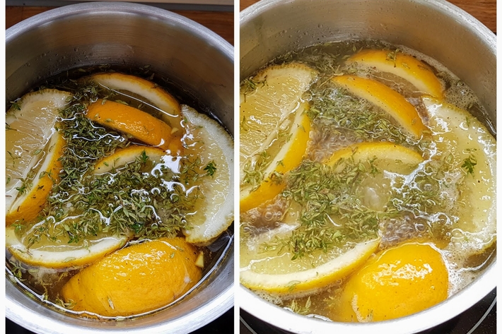 Cette étape peut très bien avoir été faite largement à l’avance. Simplement, il faudra réchauffer ce citron dans le jus qui reste.