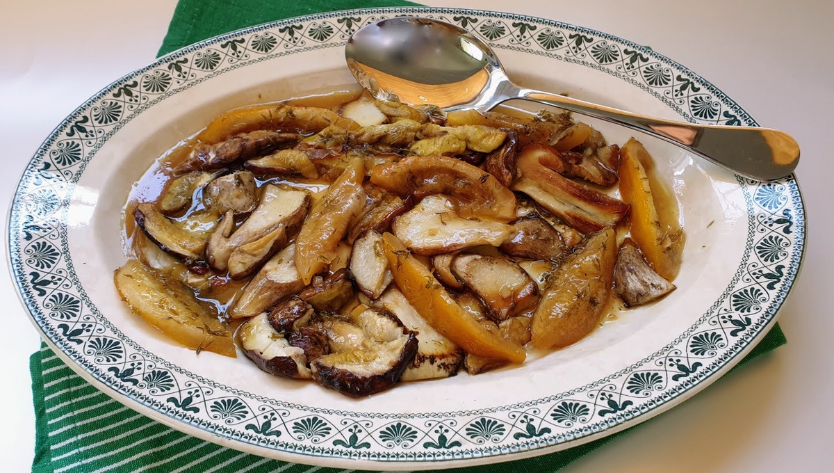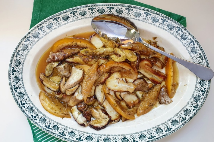 Arrosez les cèpes avec le sirop de cuisson des quartiers de citron presque entièrement réduit (ajoutez de l’eau au besoin) et répartissez les quartiers de citron confit.