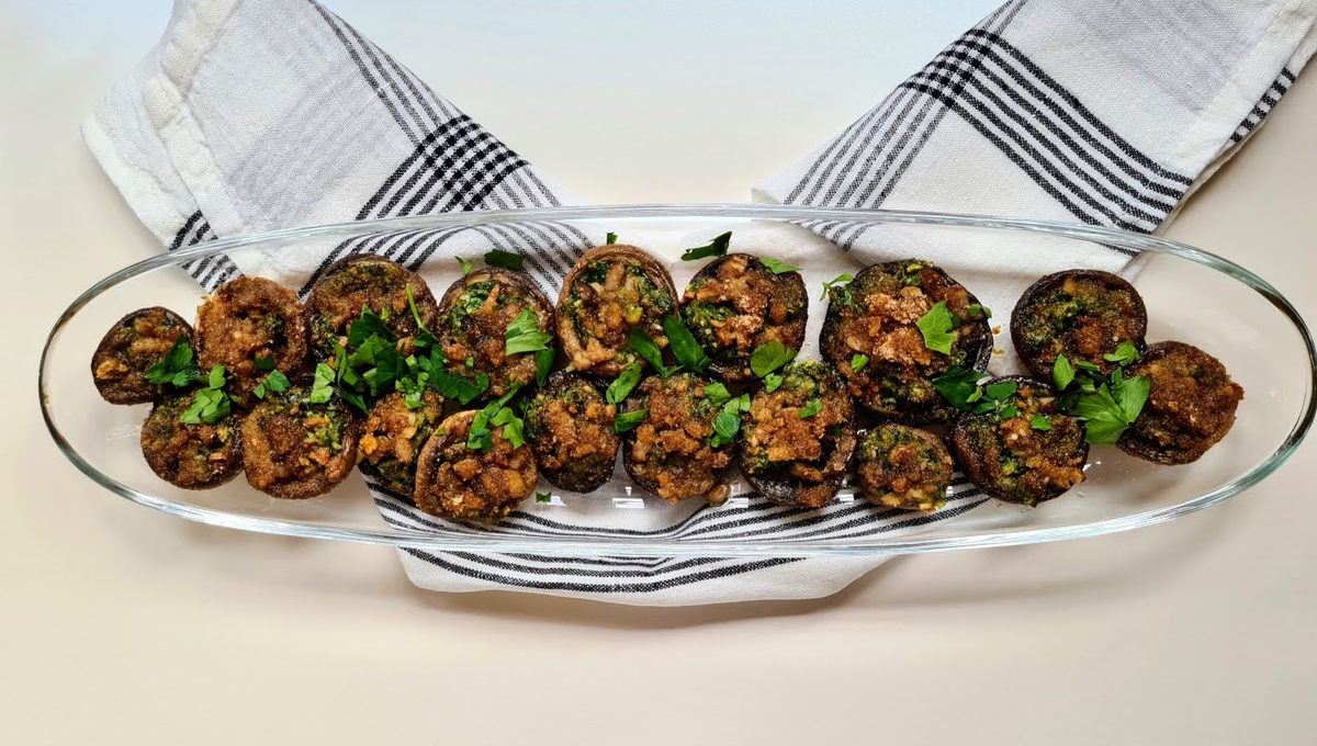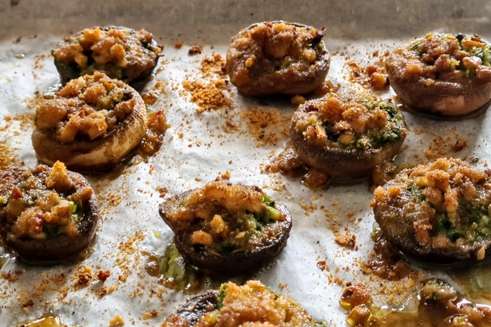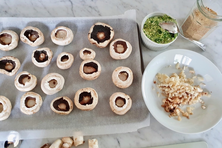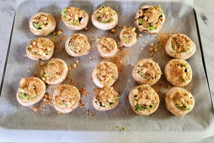 Farcissez les têtes des champignons avec le beurre d’escargot, recouvrez d’un peu de pied de champignons hachés et recouvrez de chapelure.