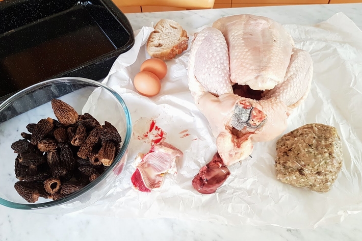 Égouttez les morilles et ajoutez-en la moitié à la farce. Mélangez bien le tout et fourrez-en (avec le gésier) le ventre de la volaille.