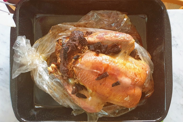 Si vous n’avez pas de sac de cuisson, faites cuire plus près de 4 heures en retournant à mi-cuisson et en arrosant la volaille de son jus toutes les demi-heures.