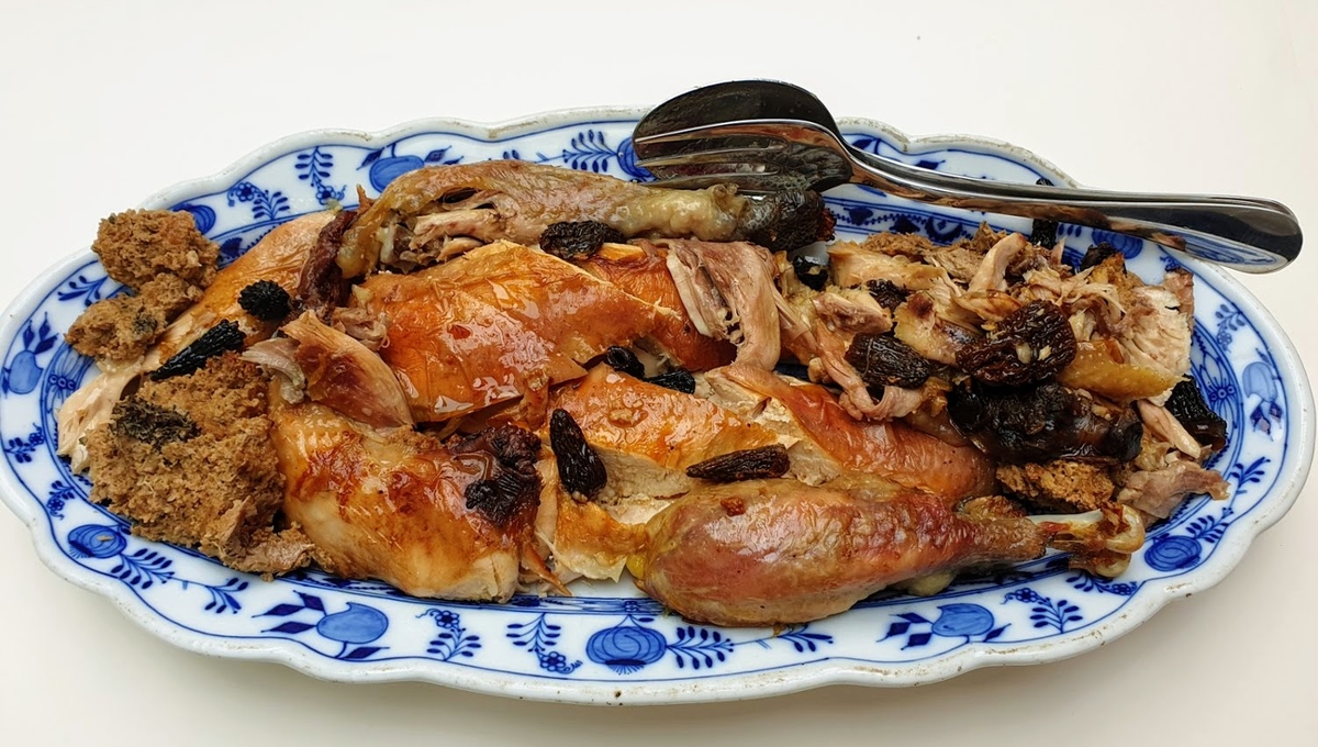 Découpez le chapon et servez-le entouré de la farce et des morilles, avec le jus dans une saucière à part.