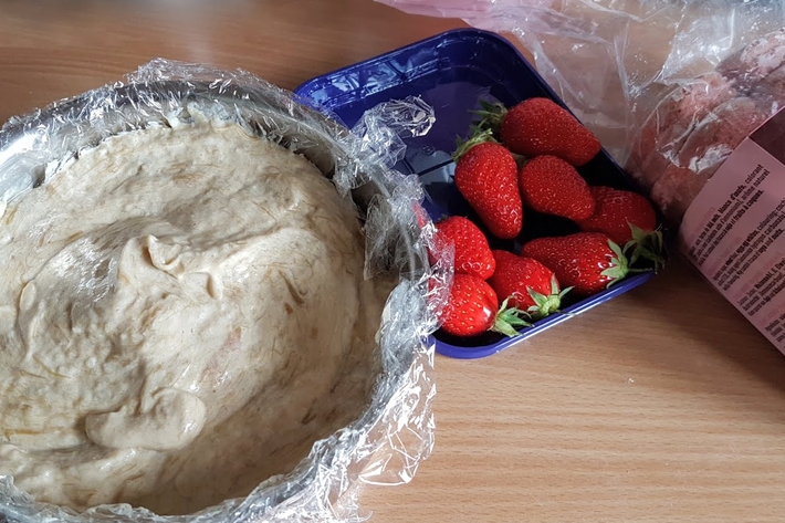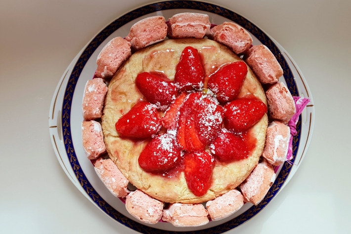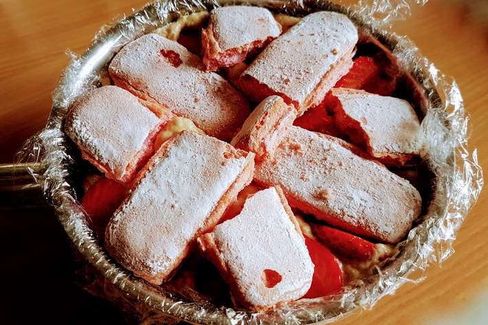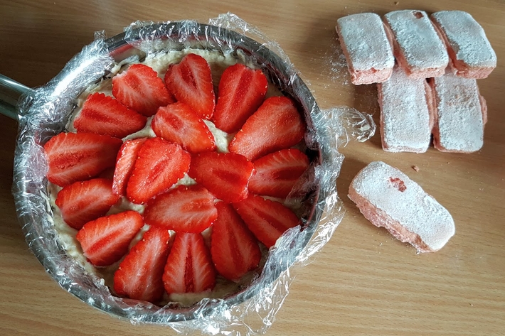 Versez un tiers de la préparation à la rhubarbe. Disposez environ 200 grammes de fraises (et gardez les autres pour le décor), puis des biscuits de Reims (attention, gardez-en une quinzaine pour le décor final). Puis une deuxième couche de rhubarbe, des fraises et biscuits de Reims.
