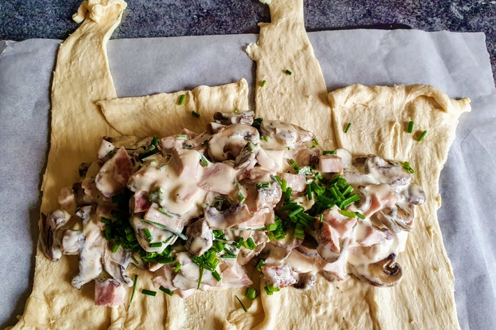 Étalez la garniture sur la pâte soudée et recouvrez avec la pointe des triangles de pâte. Tout ne sera donc pas recouvert de pâte.