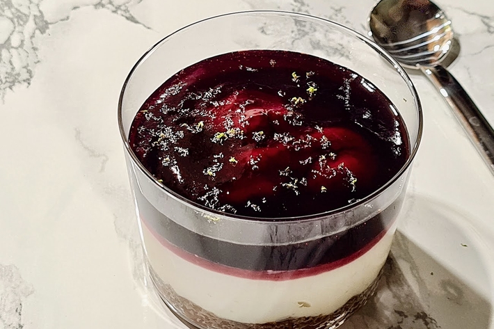 Quand le mélange au fromage est pris, faites chauffer doucement la gelée (si possible sans la faire bouillir) et répartissez-la sur le dessus des verrines.