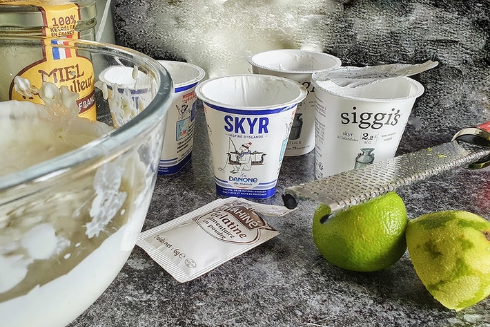 Versez les pots de skyr dans un saladier avec le miel et râpez dessus le zeste d’un citron vert.