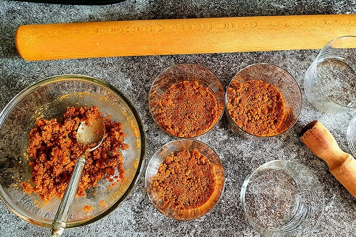 Répartissez cette pâte dans le fond des verrines en appuyant avec une cuiller à café et, éventuellement, un pilon pour aplanir la surface.