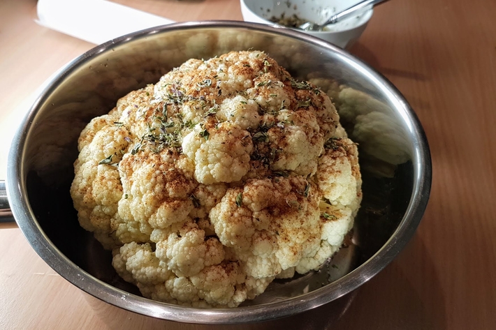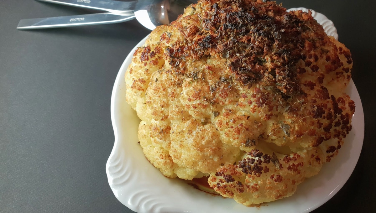 Après 50 minutes, sortez le chou-fleur du four et découvrez-le.