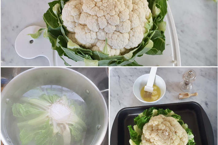 Posez le chou-fleur, tête en l’air, dans un plat à rôtir et badigeonnez-le (avec un pinceau) avec un peu de mélange beurre-huile.